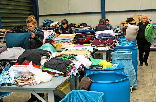 Am Sortiertisch sehen sich die Frauen die Kleidungsstücke genau an. Foto: Birgit Klein